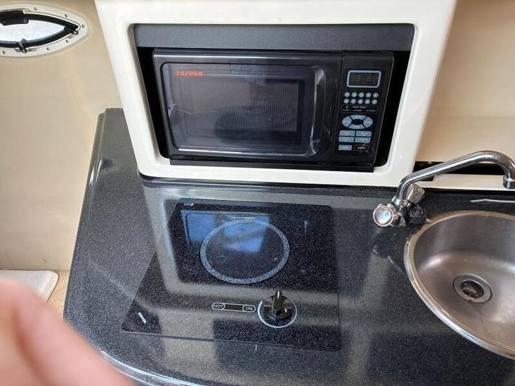With Approx. 6.2ft max headroom. Wrap around settee forward, central table which drops to provide a generous double V berth and storage areas. Galley to port equipped with a single burner ceramic electric hob, Microwave, Fridge 12/24V, stainless steel fridge and storage overhead.